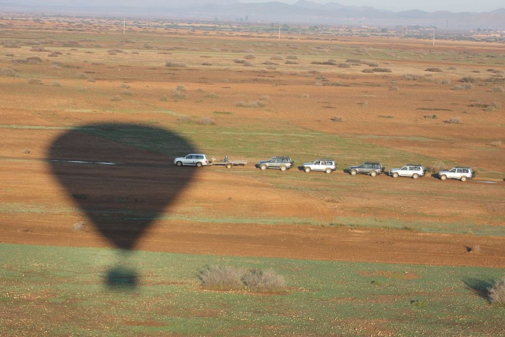 Au petit matin, une voiture vous conduira dans la campagne de Marrakech pour vous emmener vivre un rêve éveillé au lever du soleil... Vous assistez et participez au déchargement du matériel, aux essais d'allumage et enfin au gonflage du ballon, avant de faire un voyage inoubliable au-dessus de Marrakech et sa région. Un spectacle fabuleux s'offre à vous : le Maroc vu d’en haut, majestueux, encore plus pur que jamais. Après une heure de flottement, un 4x4 vous attend et vous emmène boire le thé chez l'habitant. Idéales, cette chaleur et simplicité vous feront redescendre sur terre en douceur… S’il n’y pas de mots pour décrire cette incroyable expérience, la phrase chère à Ciel d'Afrique résume à elle seule l’expérience : "la montgolfière vous fera comprendre pourquoi les oiseaux chantent…".