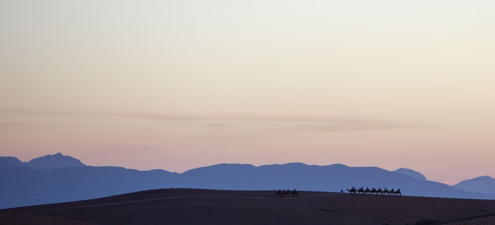 Durant les journées hors de Marrakech : guide de montagne diplômé et francophone, une équipe de chamelier.